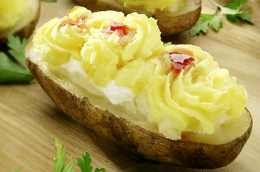 Lave las papas y úntelas de Margarina Manicera, fórrelas en papel de aluminio para colocarlas en una bandeja. Hornee a 350 grados durante 1 hora ó hasta que ablanden. Retire del horno y córtelas en dos para sacar el relleno dejando el cascarón. Maje la masa con la Margarina Manicera, la crema de leche, el queso, la nuez moscada, la sal y la pimienta.