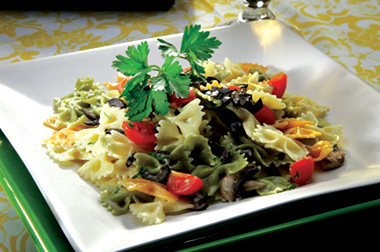Coloque la pasta en un recipiente, añada la crema, luego agregue la salsa de hongos y aceitunas. Puede agregar tomaticos cherry y perejil picadito si gusta.