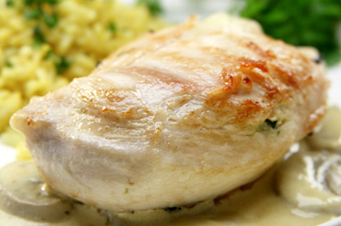 En una sartén añada la Margarina Manicera y sofría el resto de los hongos con la crema de leche y los demas ingredientes. Deje cocinar a fuego lento. Coloque las pechugas en un molde refractario (pyrex), luego anada la salsa. Hornee por 5 minutos.